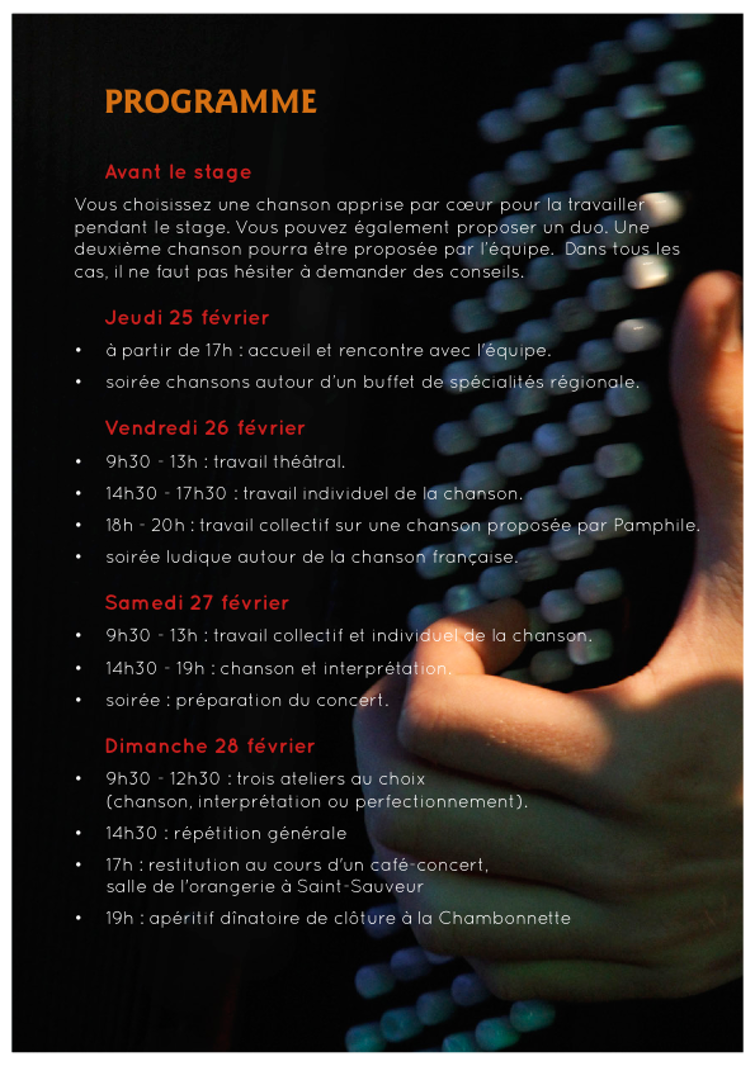 Adapté à tous les niveaux, un travail individuel et collectif dans un groupe de 6 personnes maximum, à cause de la situation sanitaire, avec des soirées jeux autour de la chanson française (« à la manière de », enchainement de chansons, pictionnary adapté, (re)connaissance de chansons, articulation…)